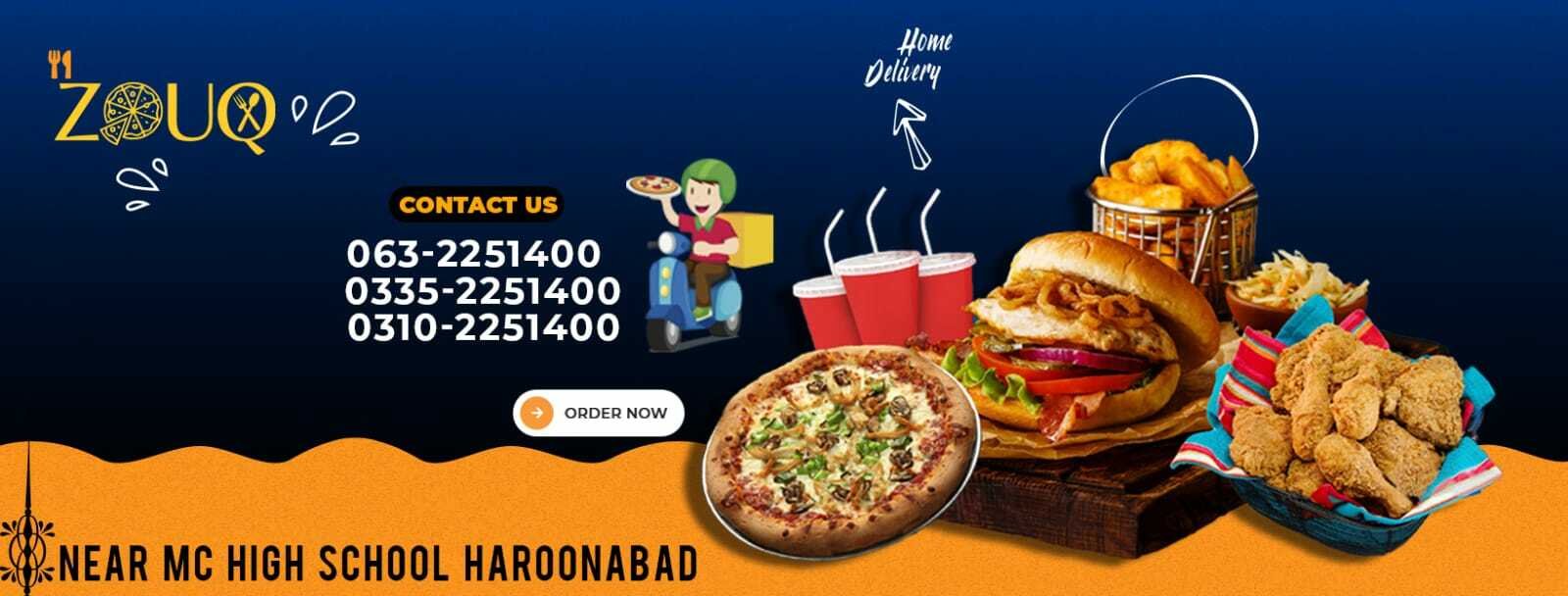 Zouq Restaurant Haroonabad is offering a combination of national desi and fast food. Our range of food includes burgers, pizzas, fries and different kinds of drinks. For more information you can visit our facebook page.